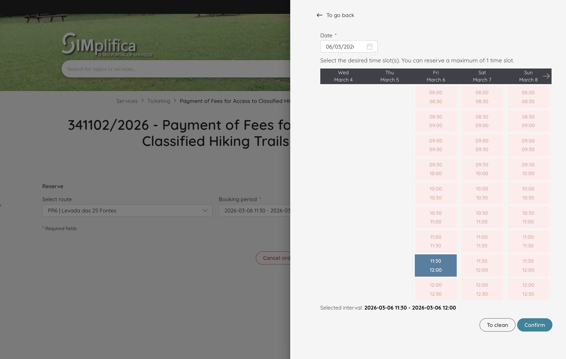 Again, I’m choosing “Levada das 25 de Fontes” and the time slot I wanted. Click on the calendar icon on the second “booking period” menu.